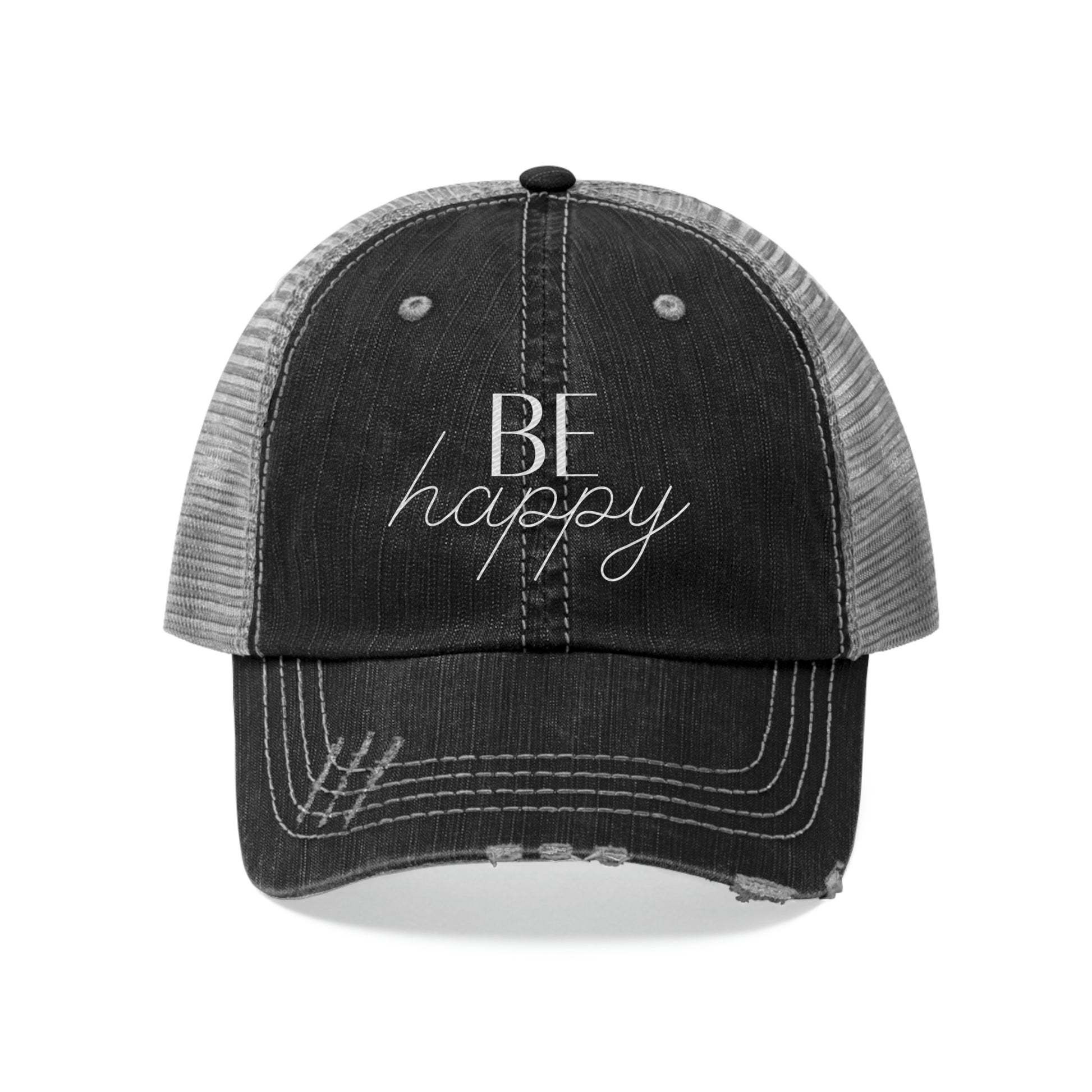 Be Happy Trucker Hat will be the envy of all of your friends. With a simple design and a comfortable fit, this will become your new favorite. A breathable mesh backing and herringbone cotton front give this hat a rugged look, while the pre-curved frayed visor and unstructured crown guarantee a perfect natural fit from the moment you put it on your head.