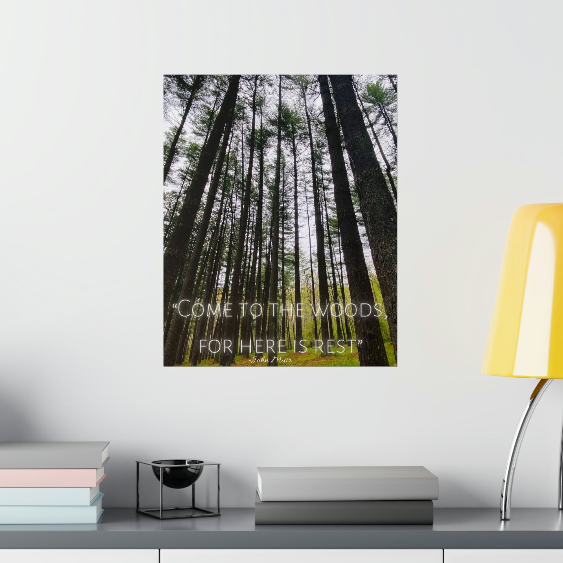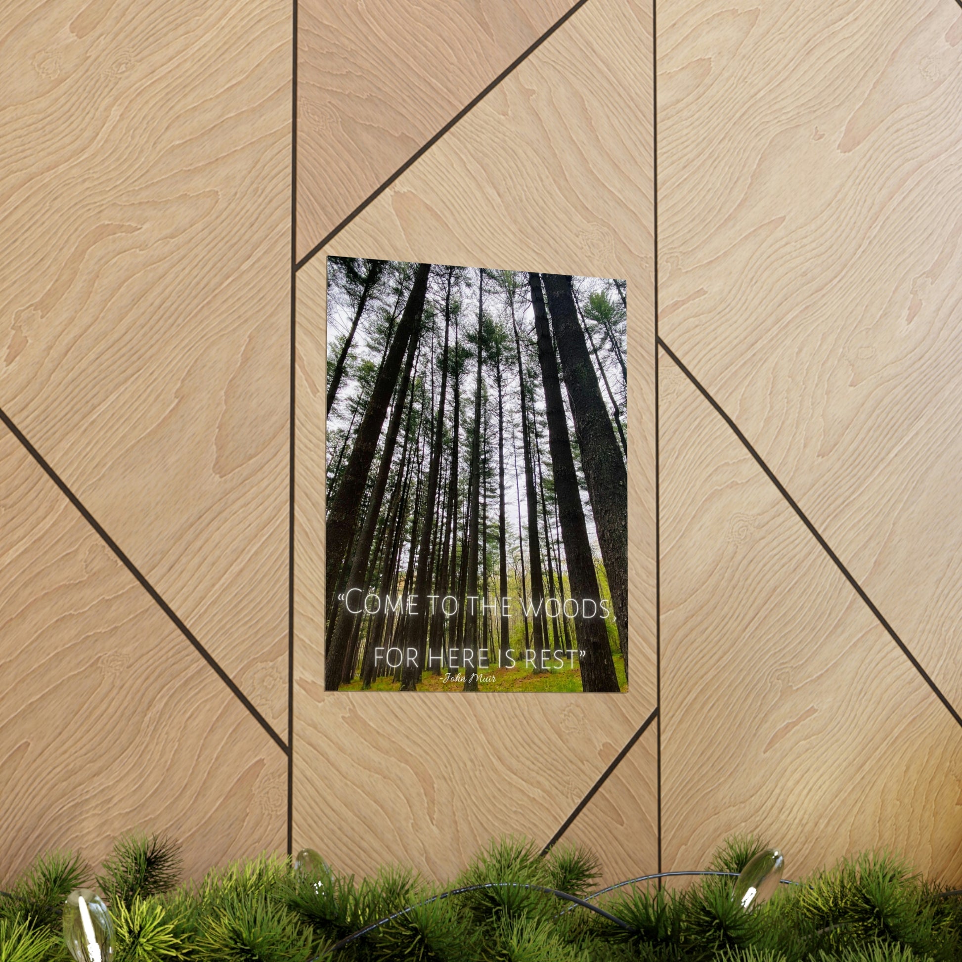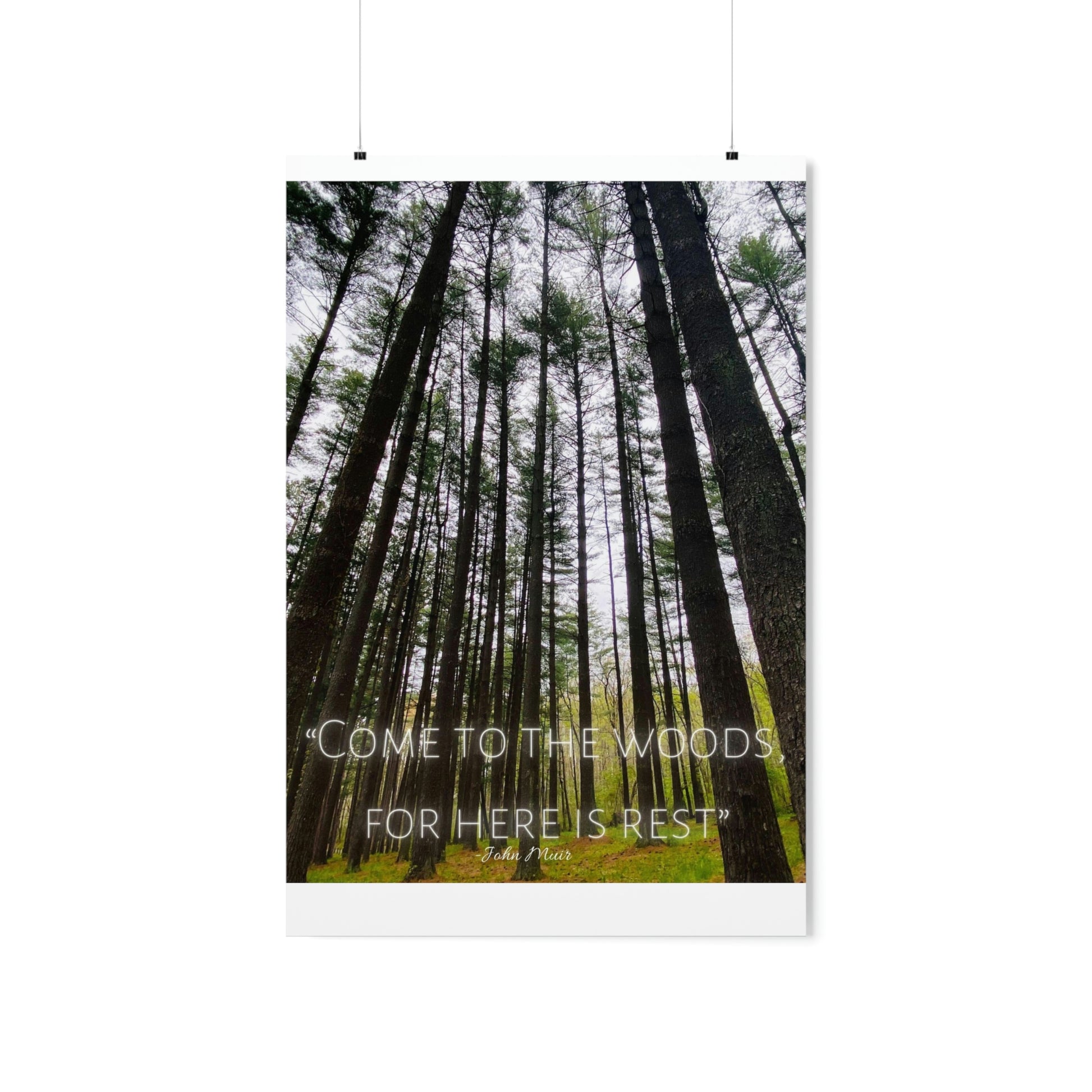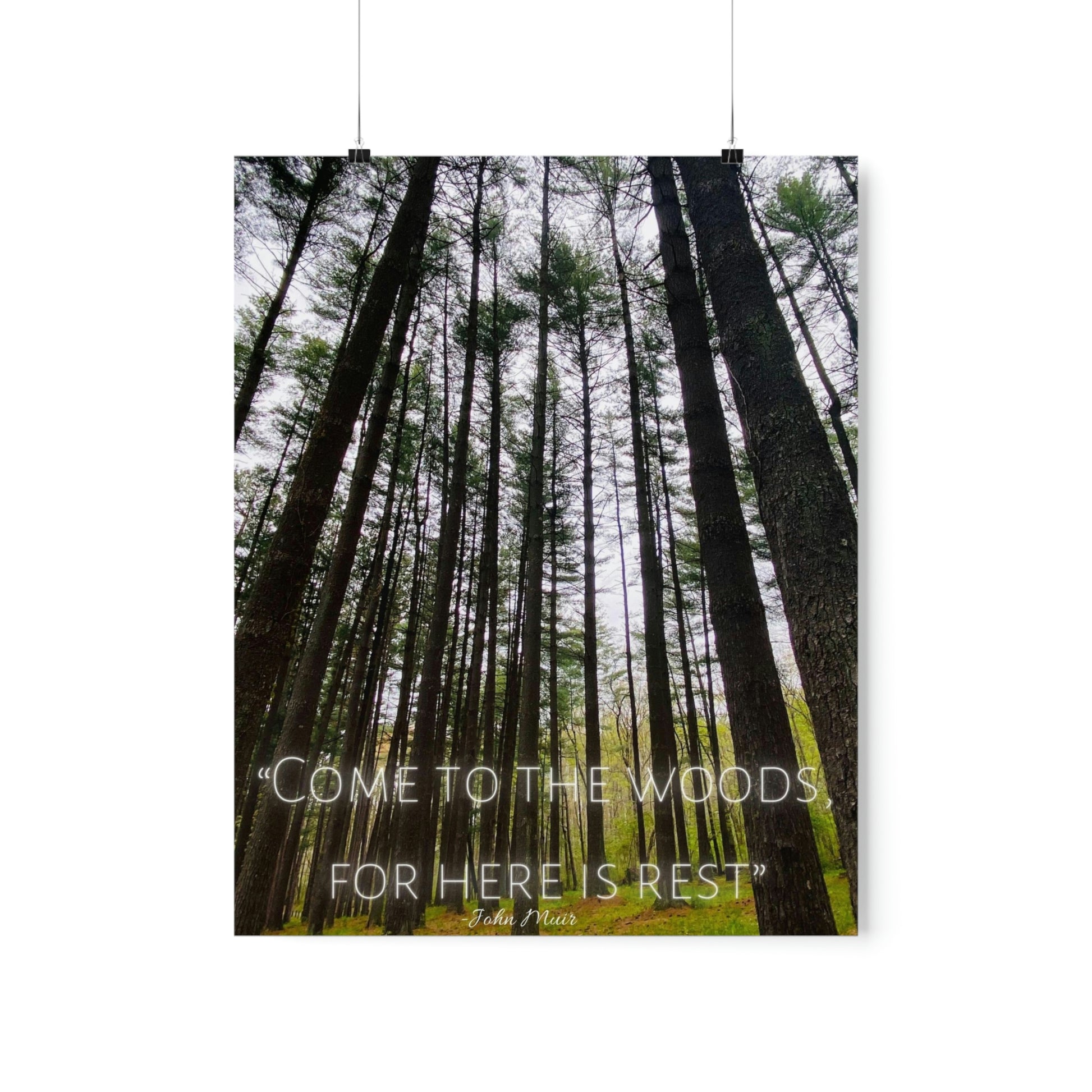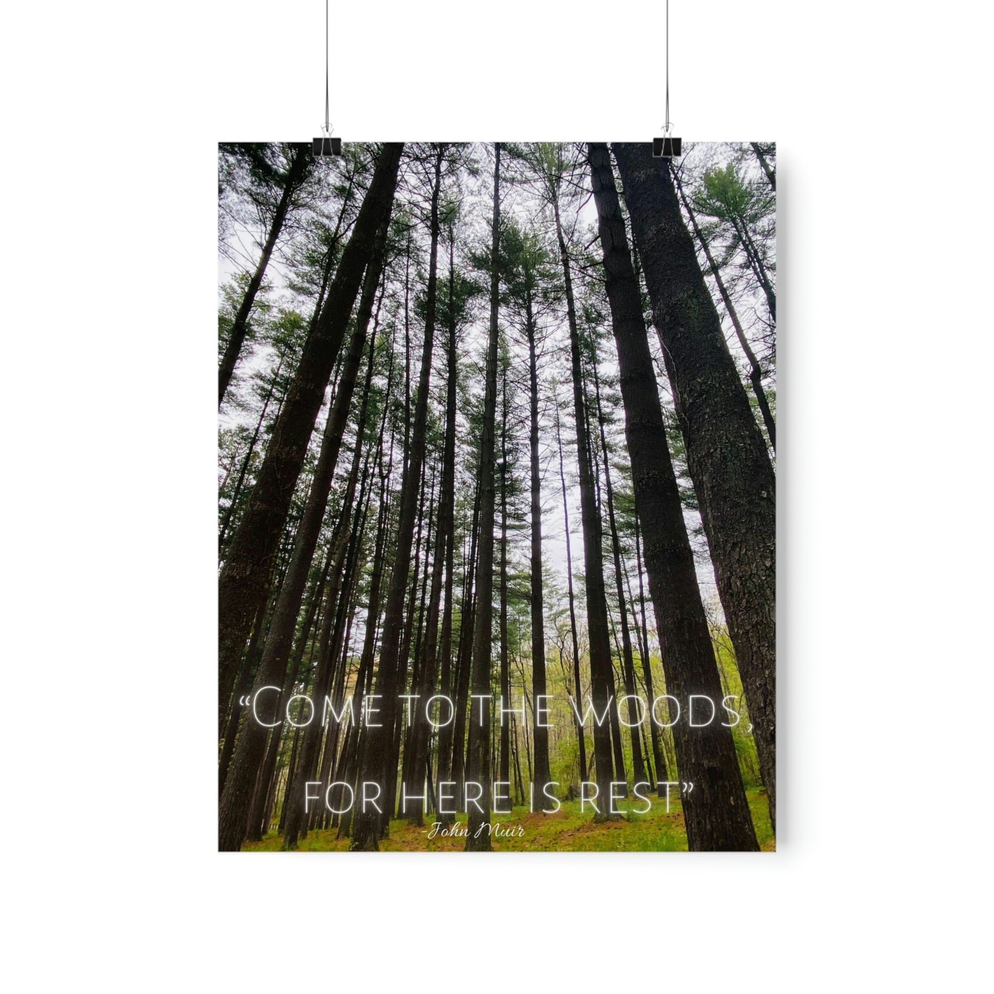 John Muir quote "Come to the woods, for here is rest" Forest Premium Poster. Made with museum-grade paper (175gsm fine art paper), each poster is printed with top-tier pigmented archival inks for a stunning end result. Perfect for the nature lover, hiker, and mindful alike.