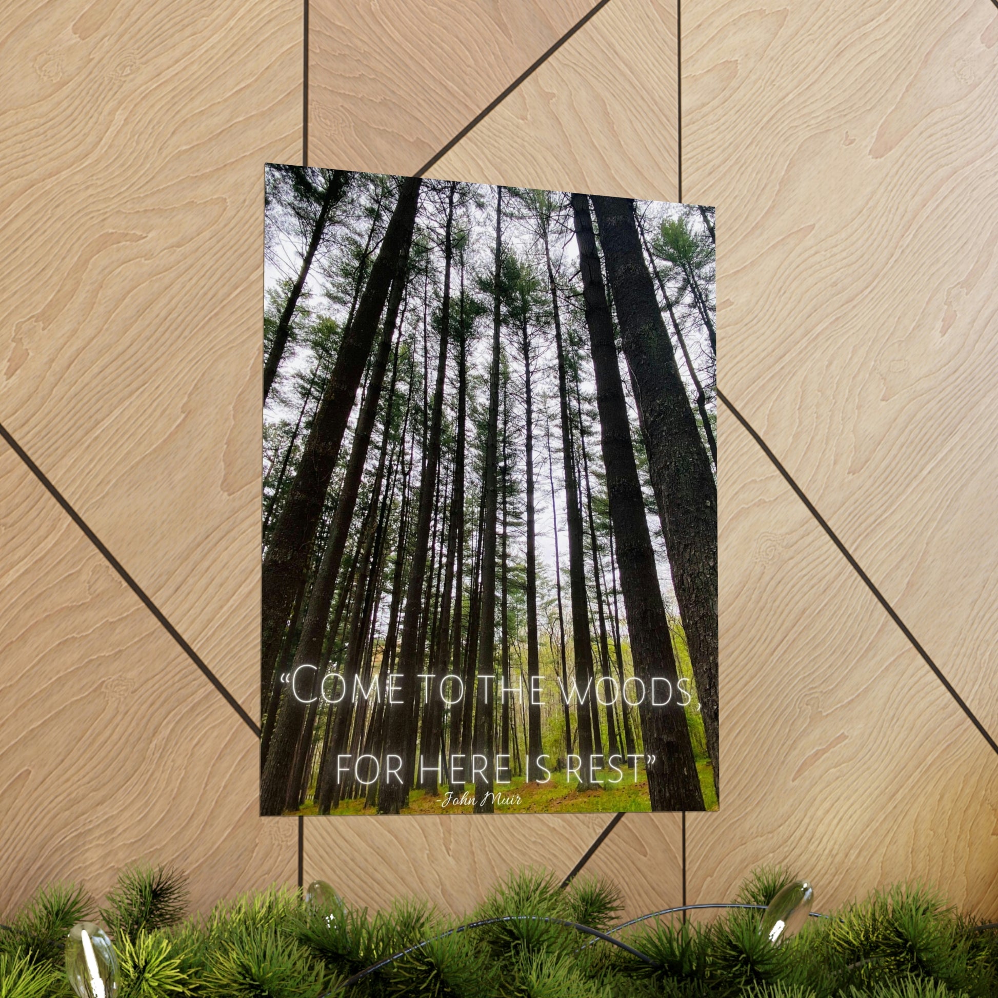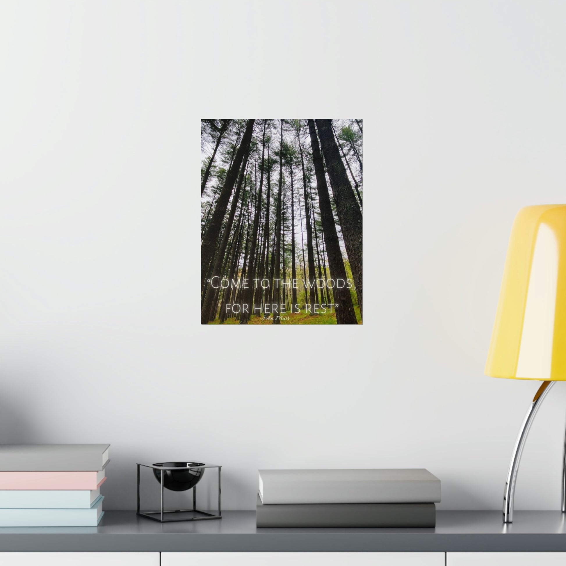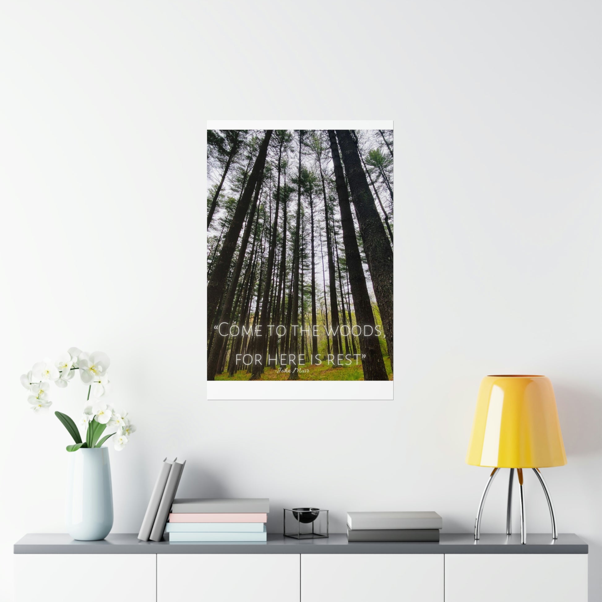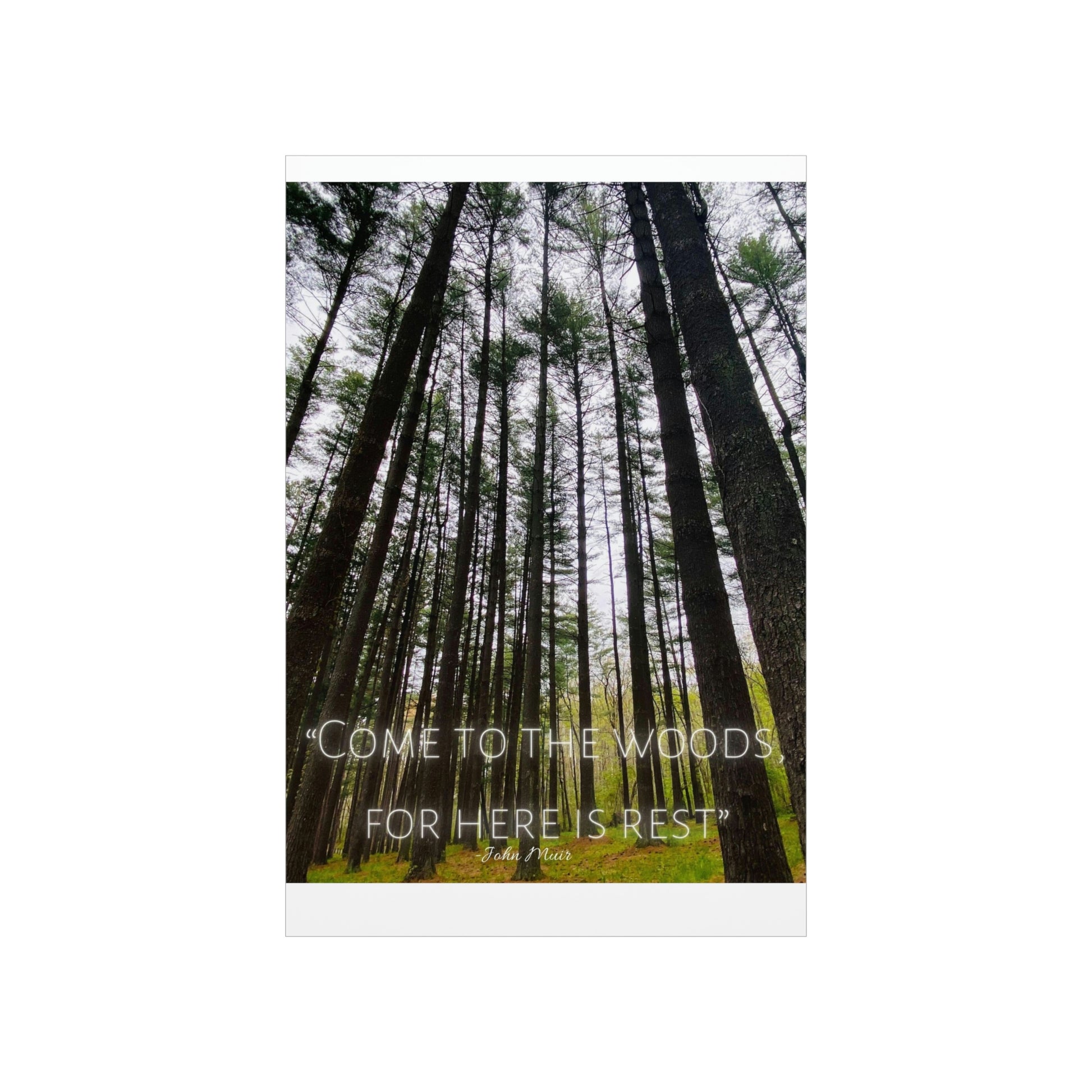 John Muir quote "Come to the woods, for here is rest" Forest Premium Poster. Made with museum-grade paper (175gsm fine art paper), each poster is printed with top-tier pigmented archival inks for a stunning end result. Perfect for the nature lover, hiker, and mindful alike.