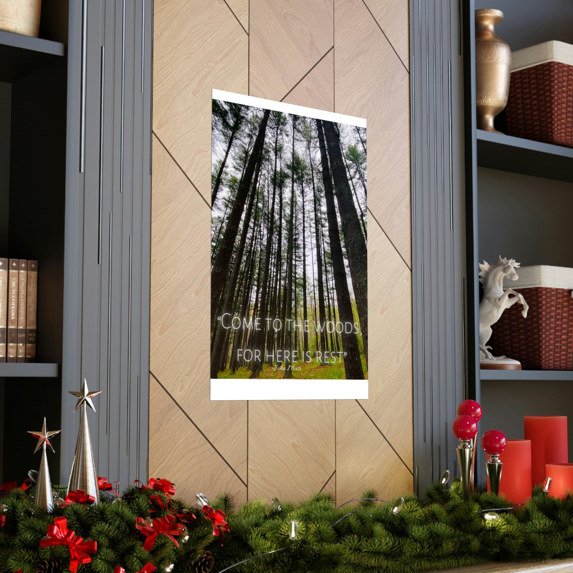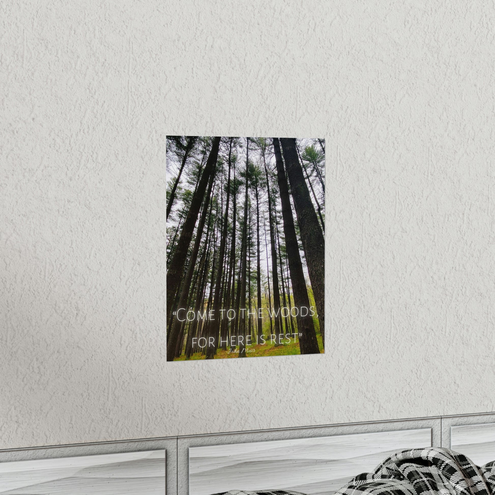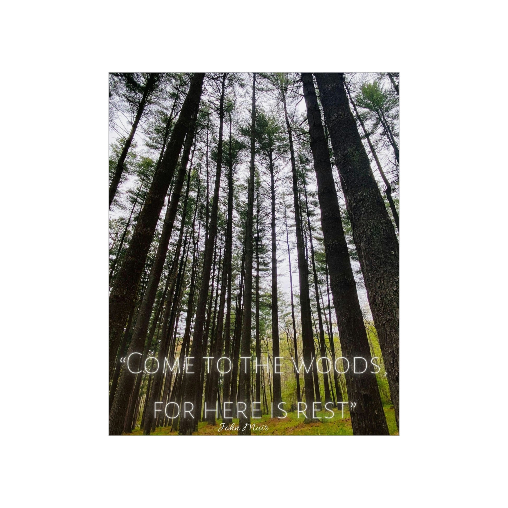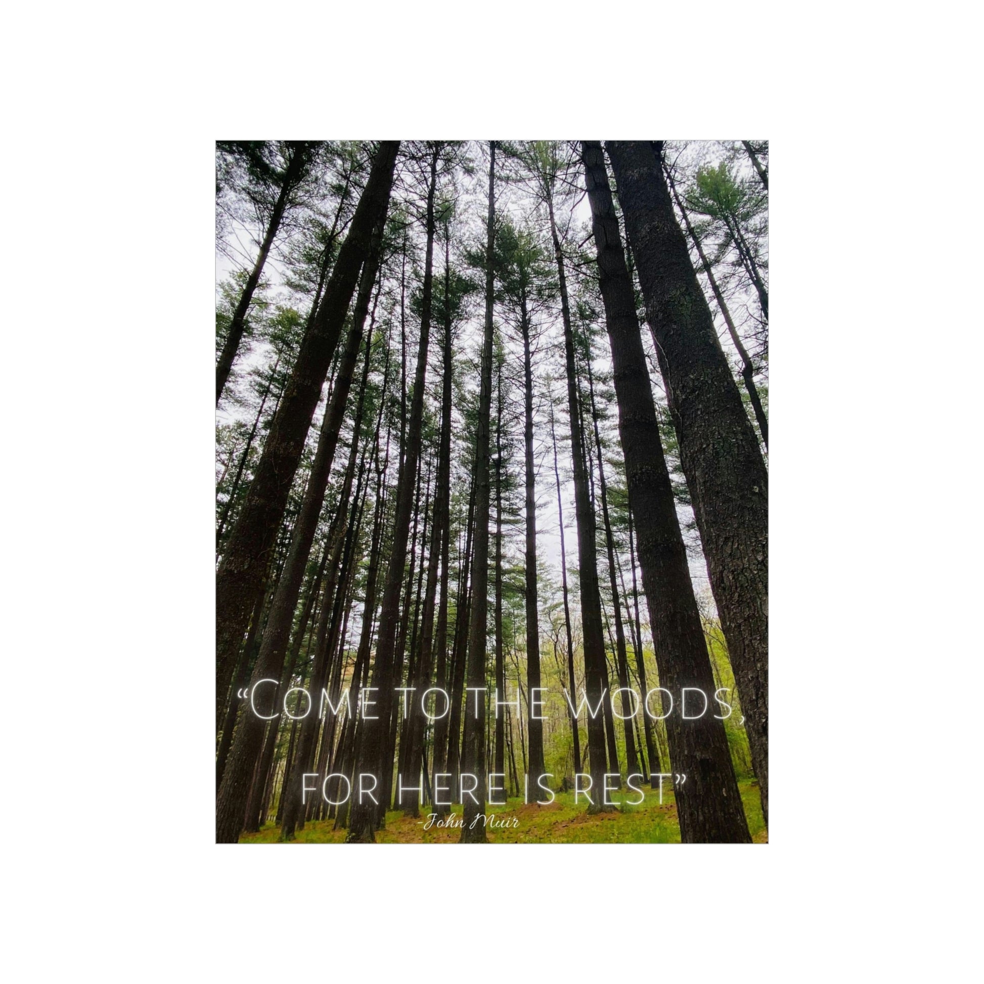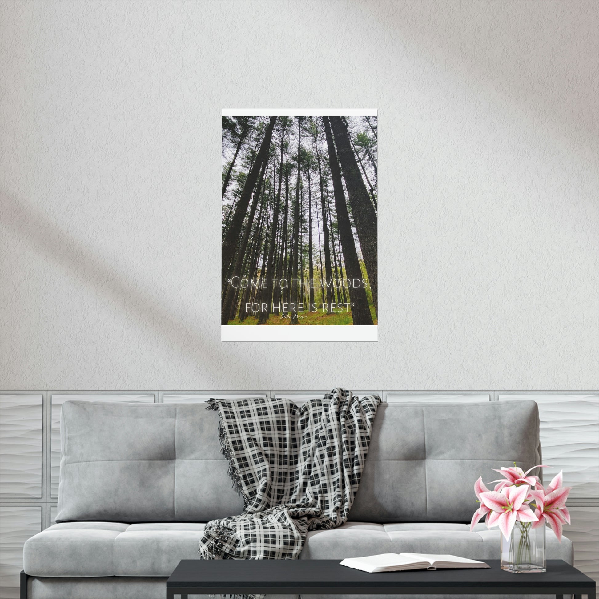 John Muir quote "Come to the woods, for here is rest" Forest Premium Poster. Made with museum-grade paper (175gsm fine art paper), each poster is printed with top-tier pigmented archival inks for a stunning end result. Perfect for the nature lover, hiker, and mindful alike.