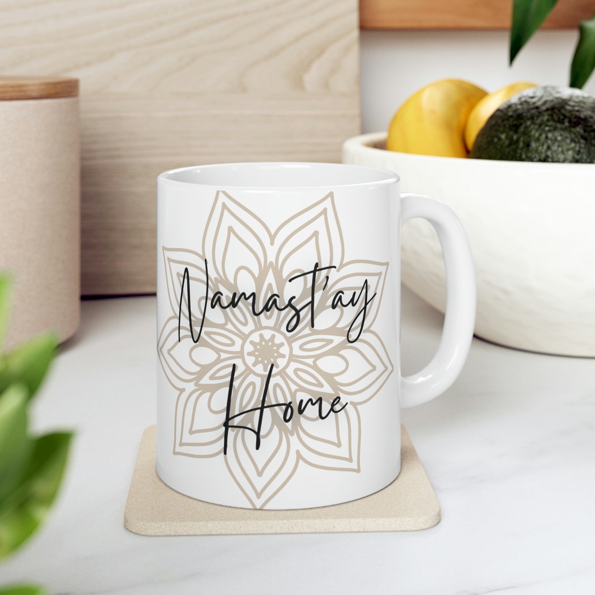 Namast'ay Home 11 oz Mug. Some days you just wanna take a breath and stay home. It’s BPA and Lead-free, microwave & dishwasher-safe, and made of white, durable ceramic in an 11-ounce size. The perfect gift for coffee, tea, and chocolate lovers.