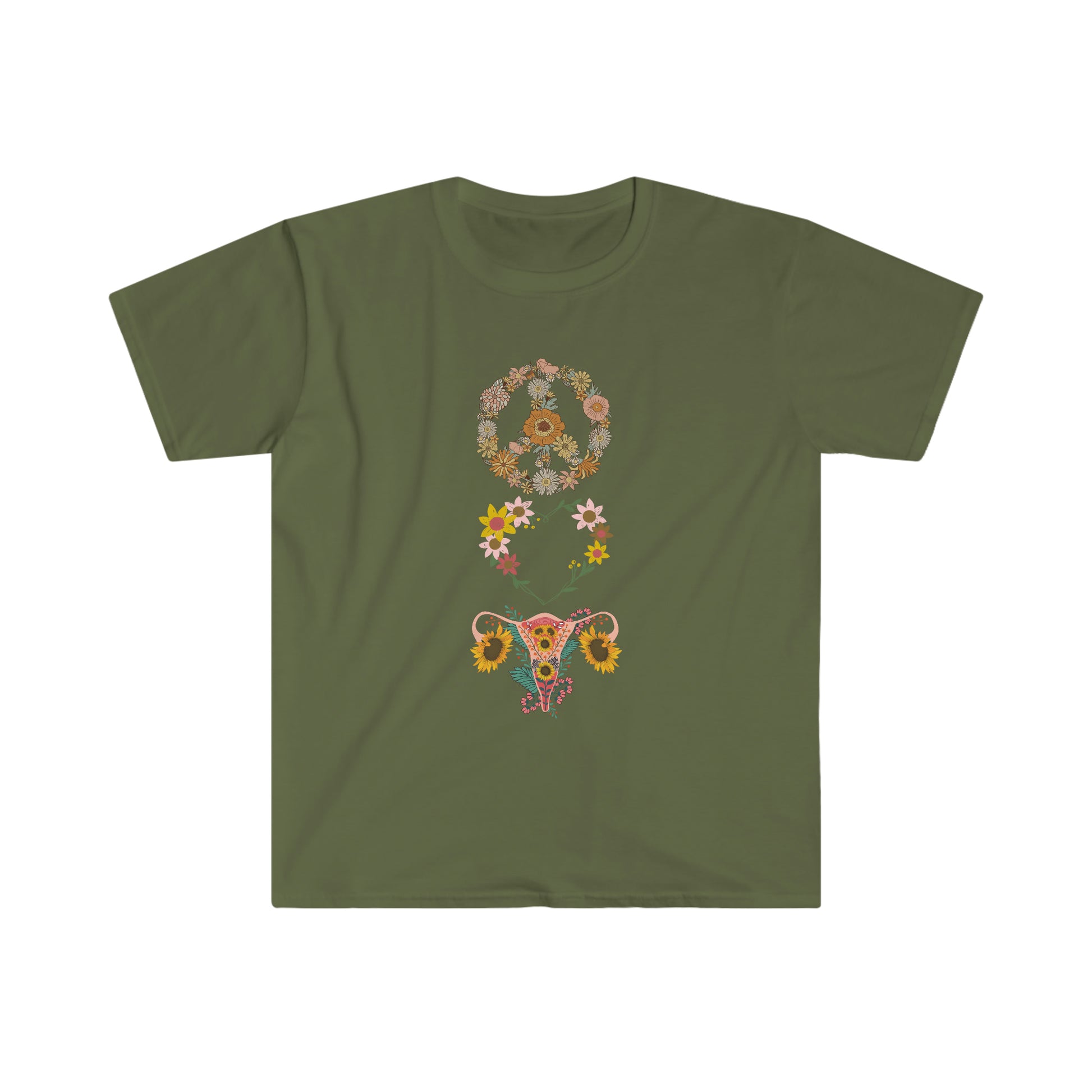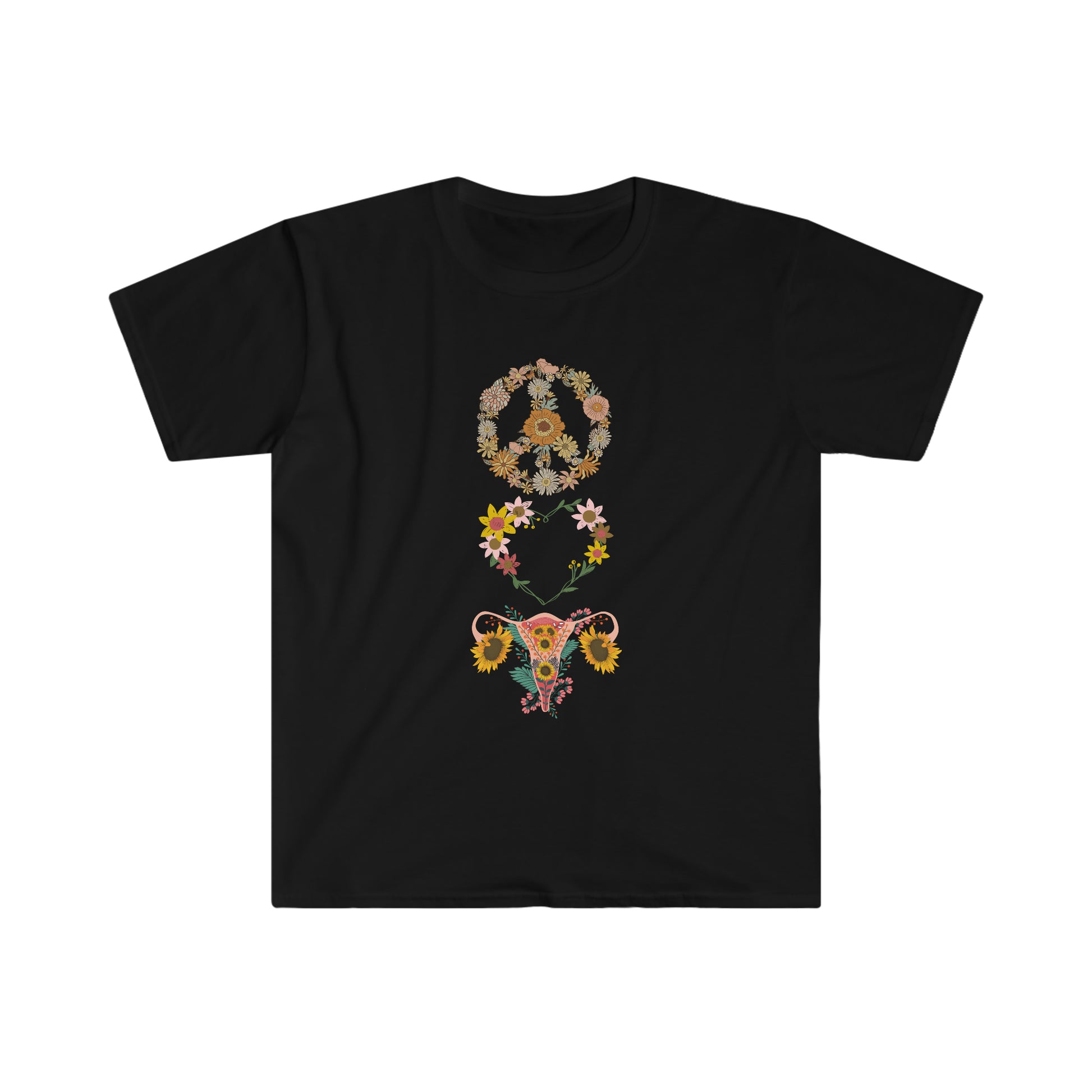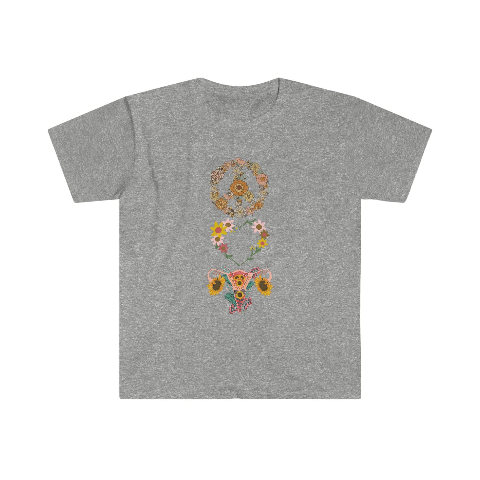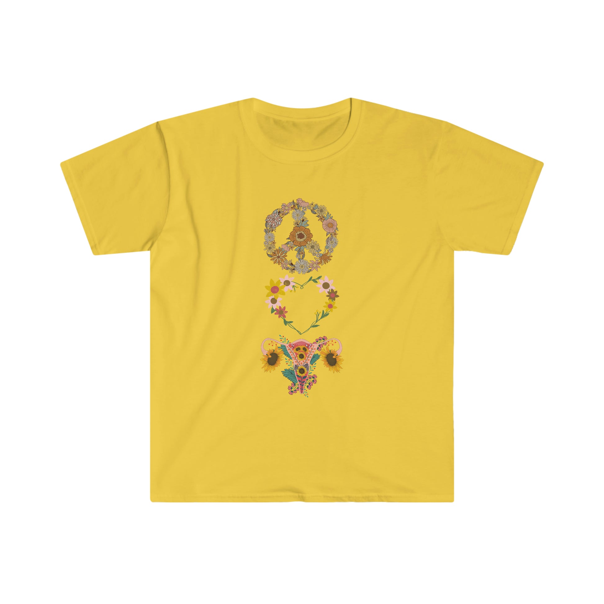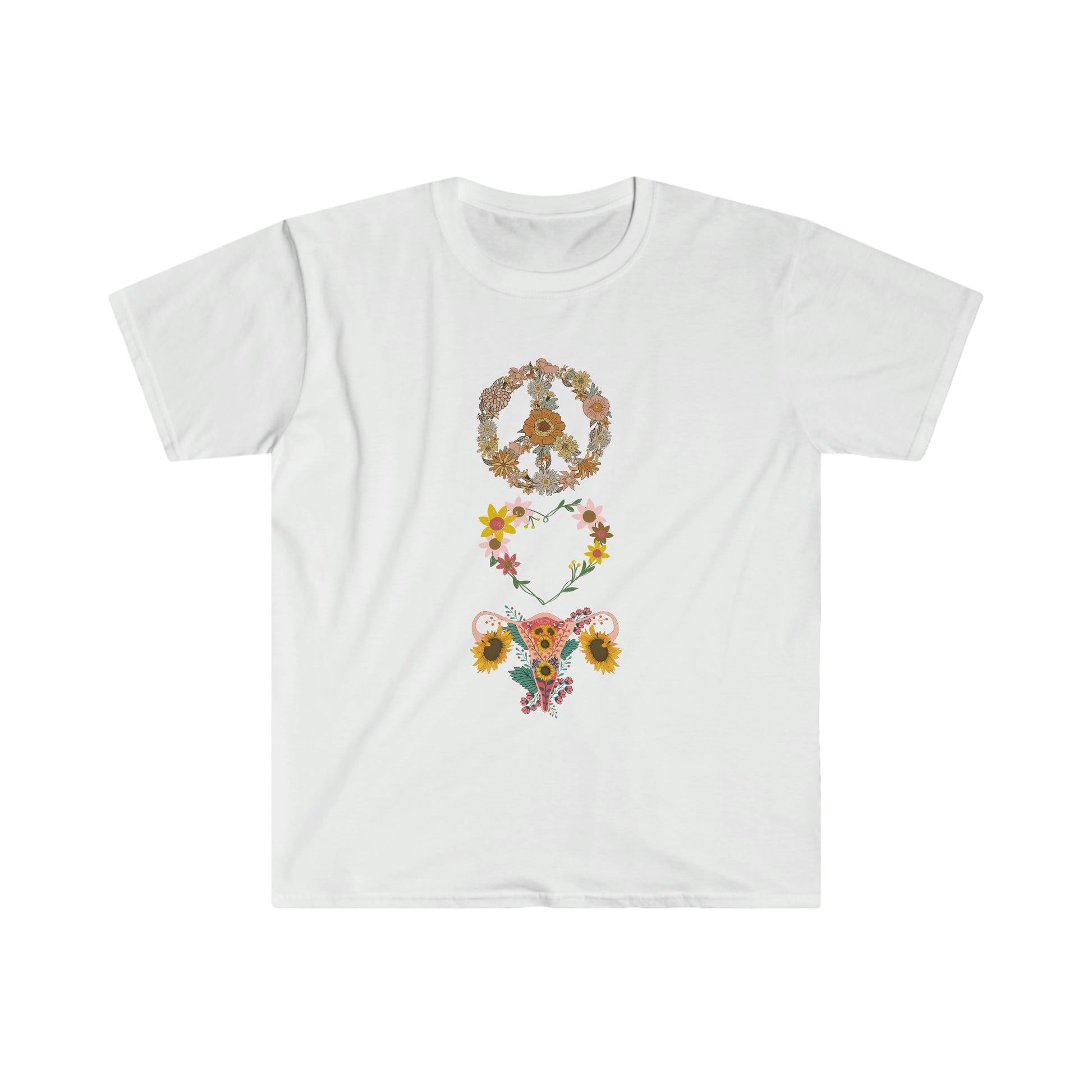 Peace, Love, and Women's Rights are bringing beautiful hippie vibes to the store. This incredible design is also available in color blast as well. Heather colors and sports grey include polyester. The shoulders have twill tape for improved durability. There are no side seams. The collar is made with ribbed knitting to prevent curling damage.
