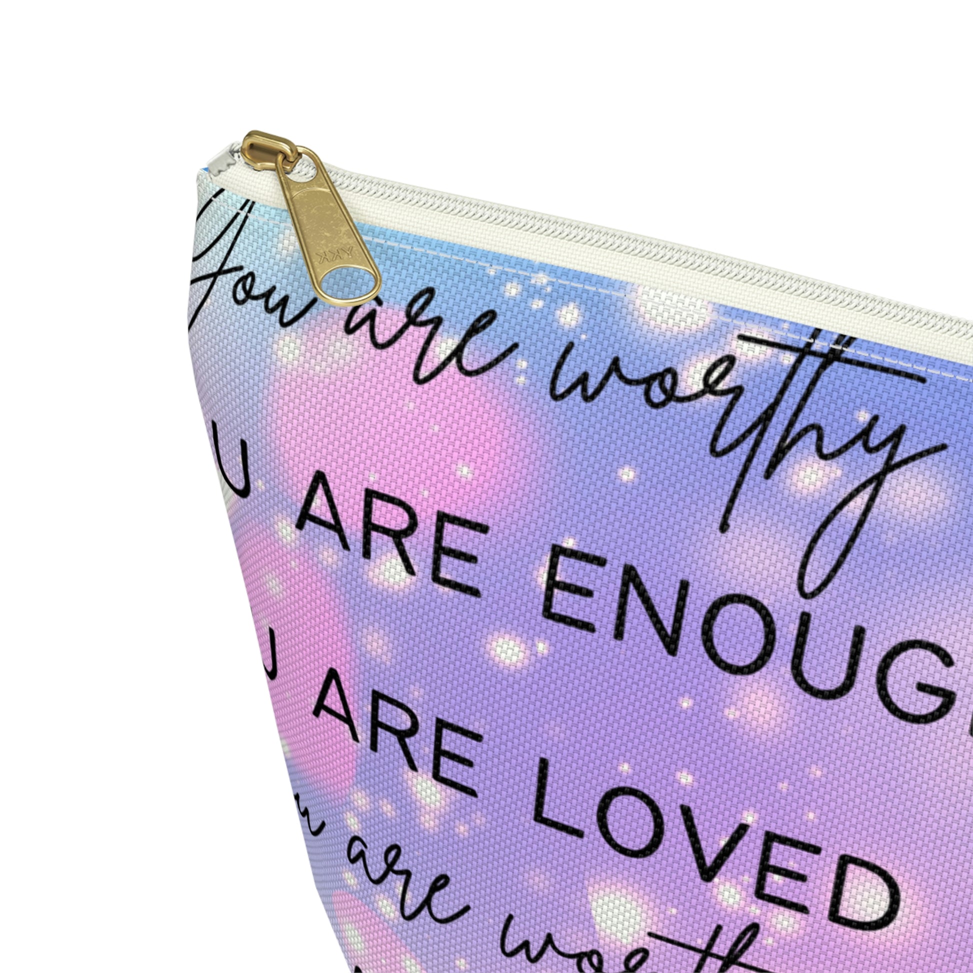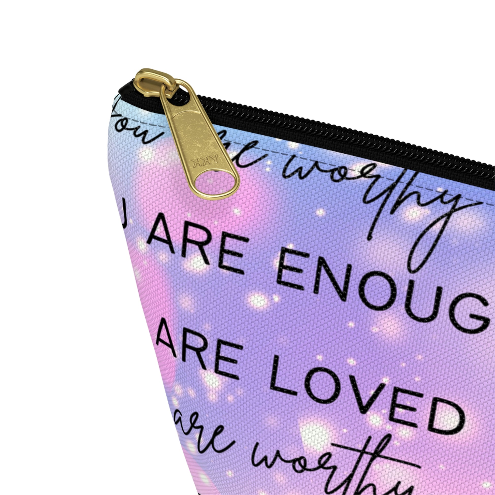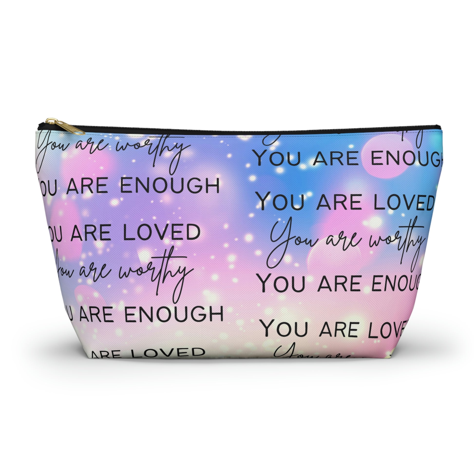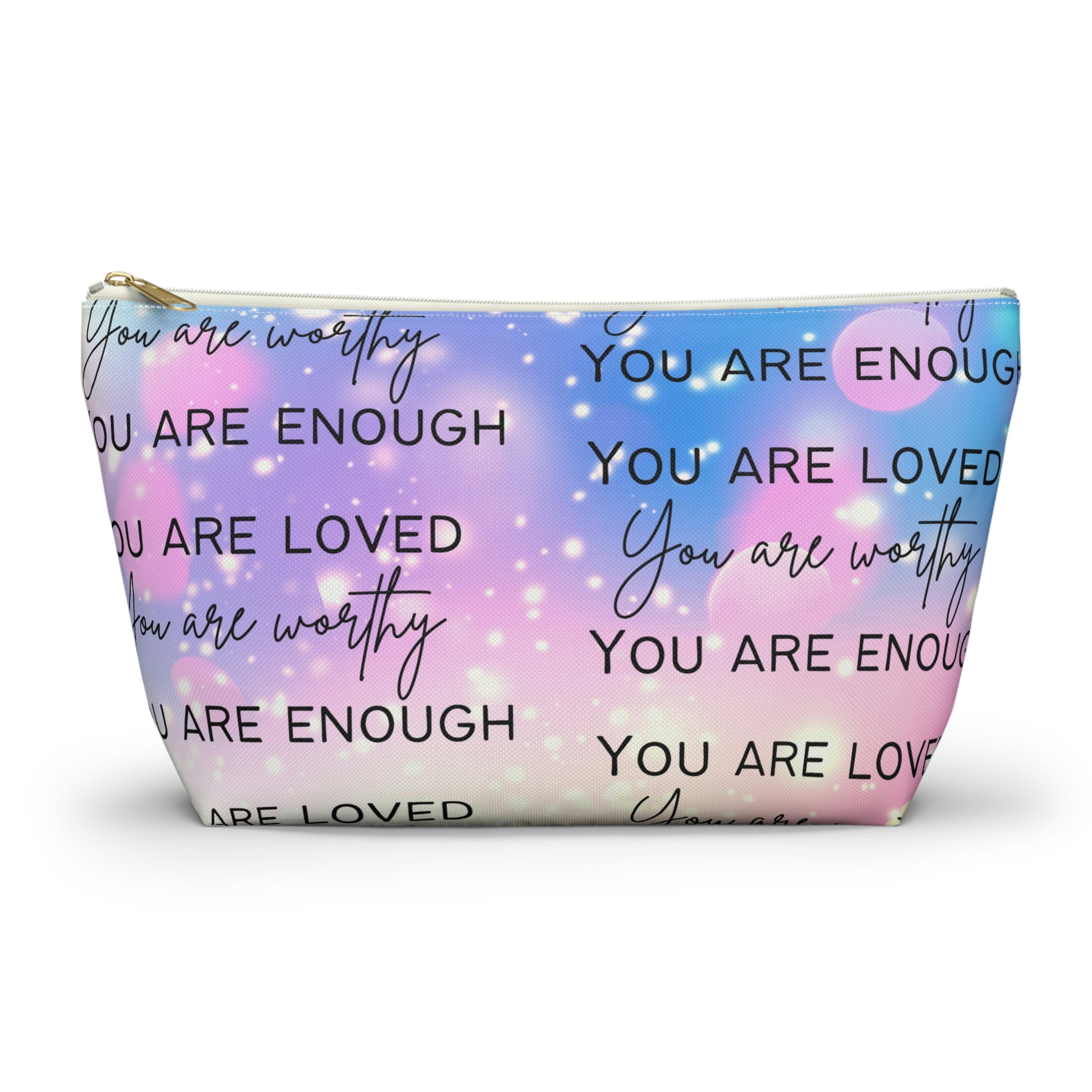 You are loved, You are enough, You are worthy... Carry these positive affirmations with you in this beautiful t-bottom mermaid colored cosmetic/travel bag. Available in 2 sizes, with 2 options for zipper color.