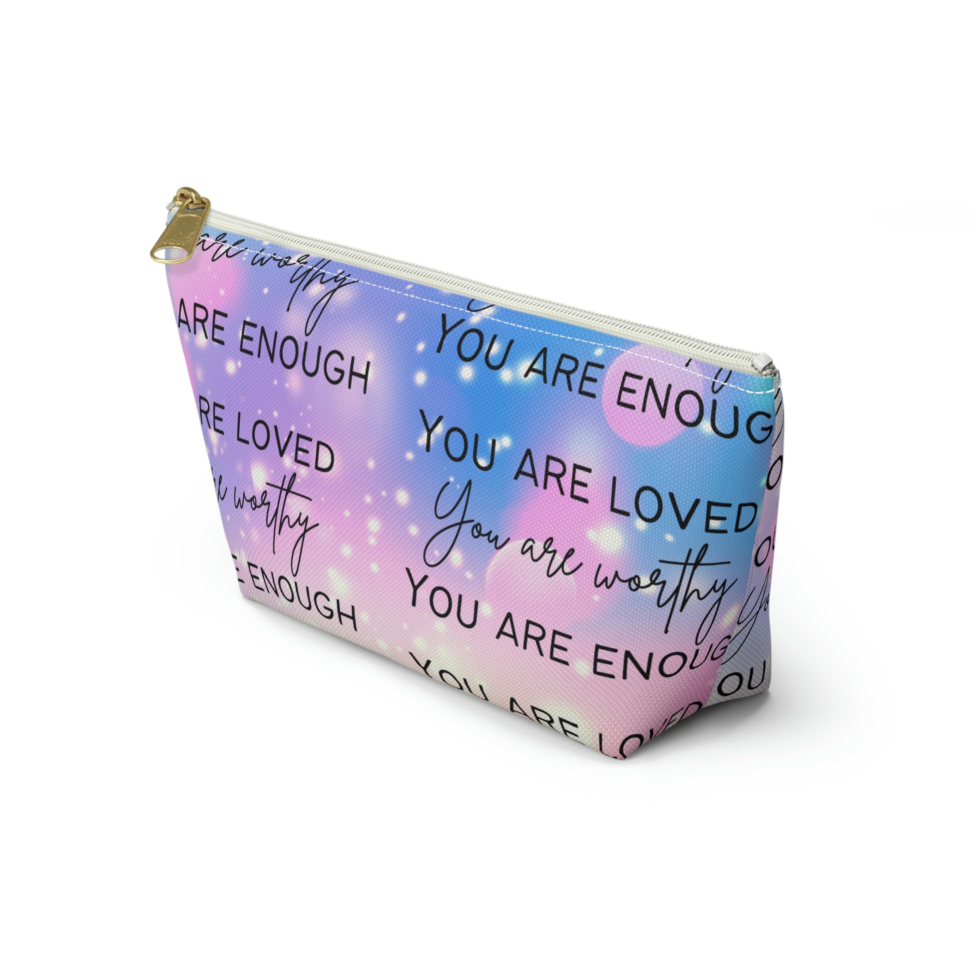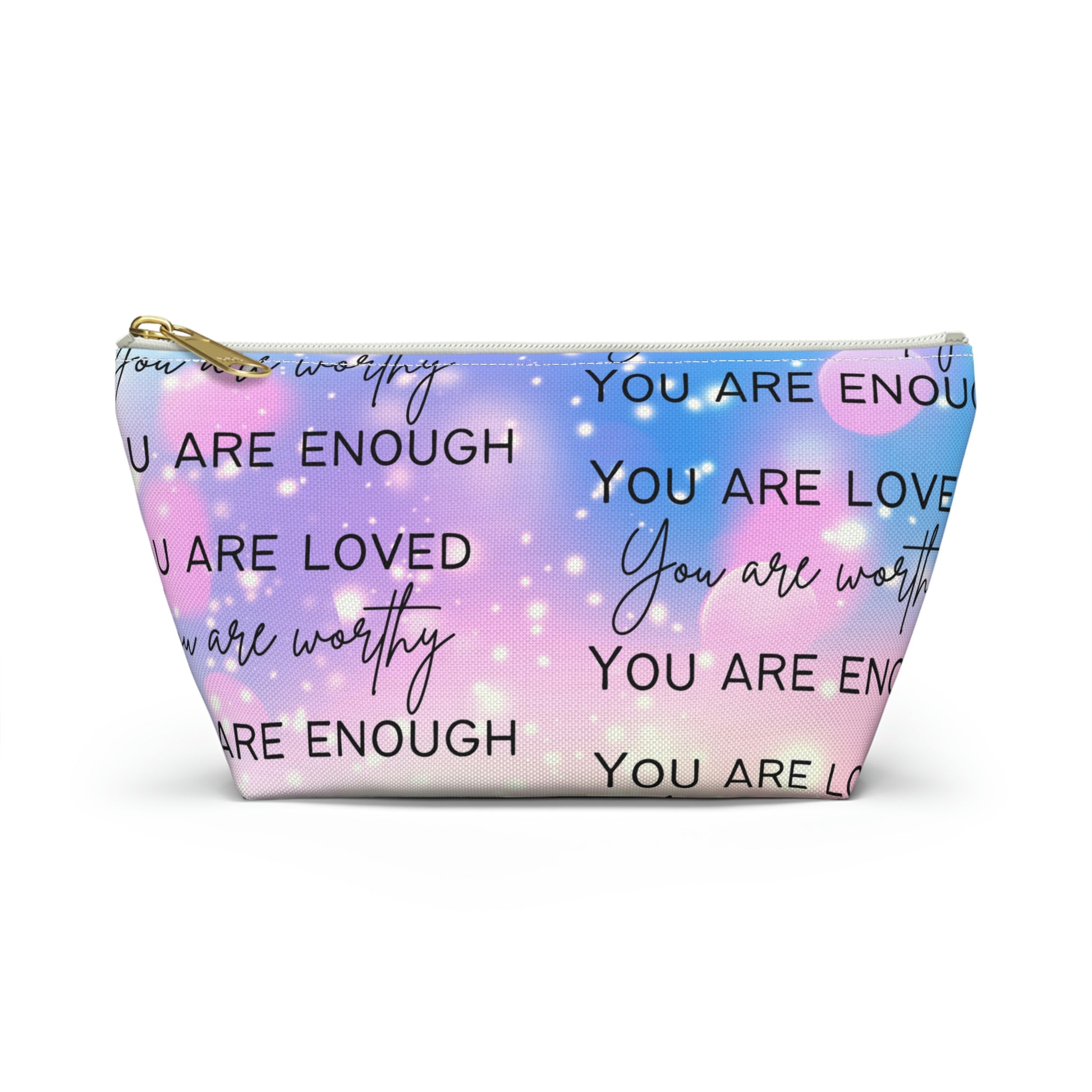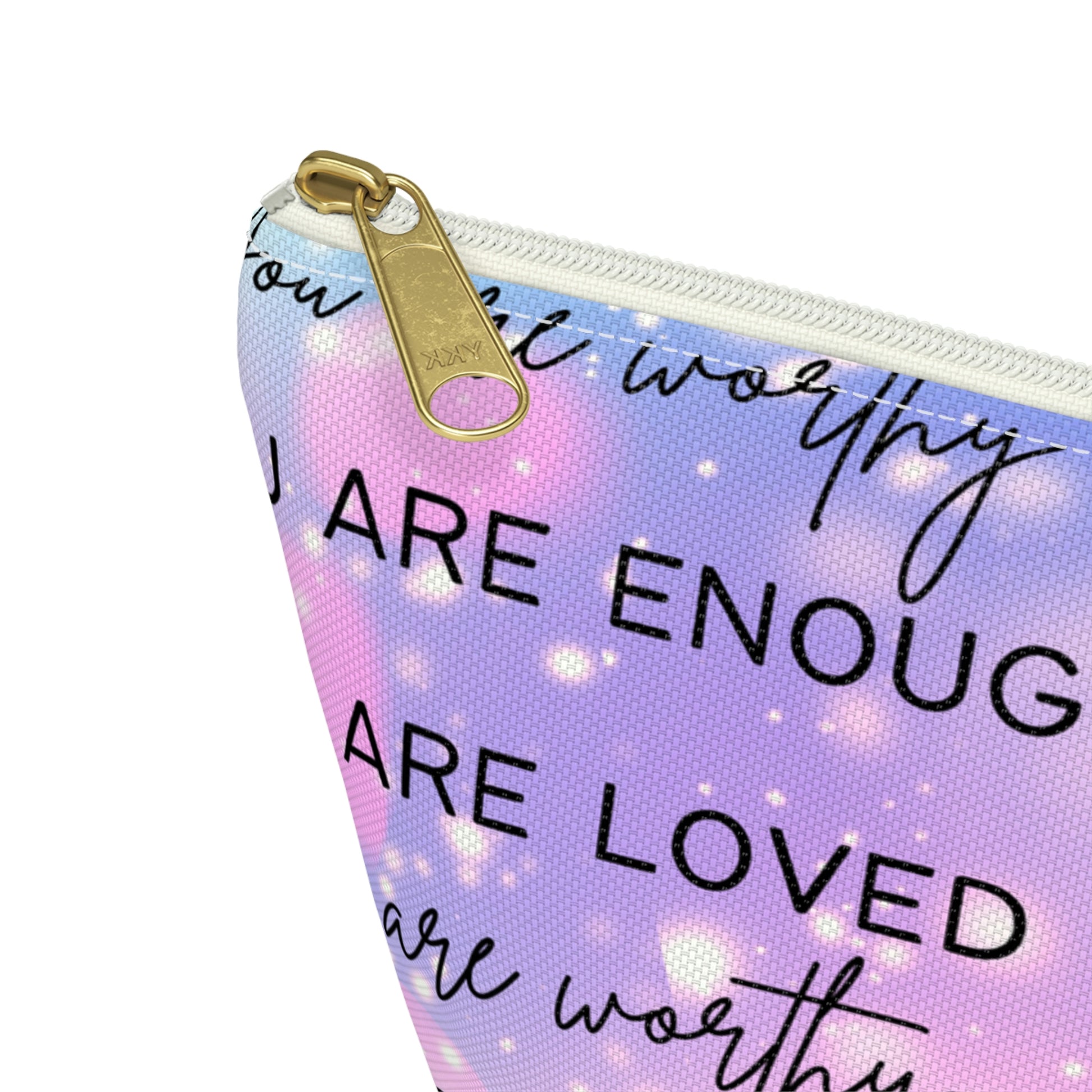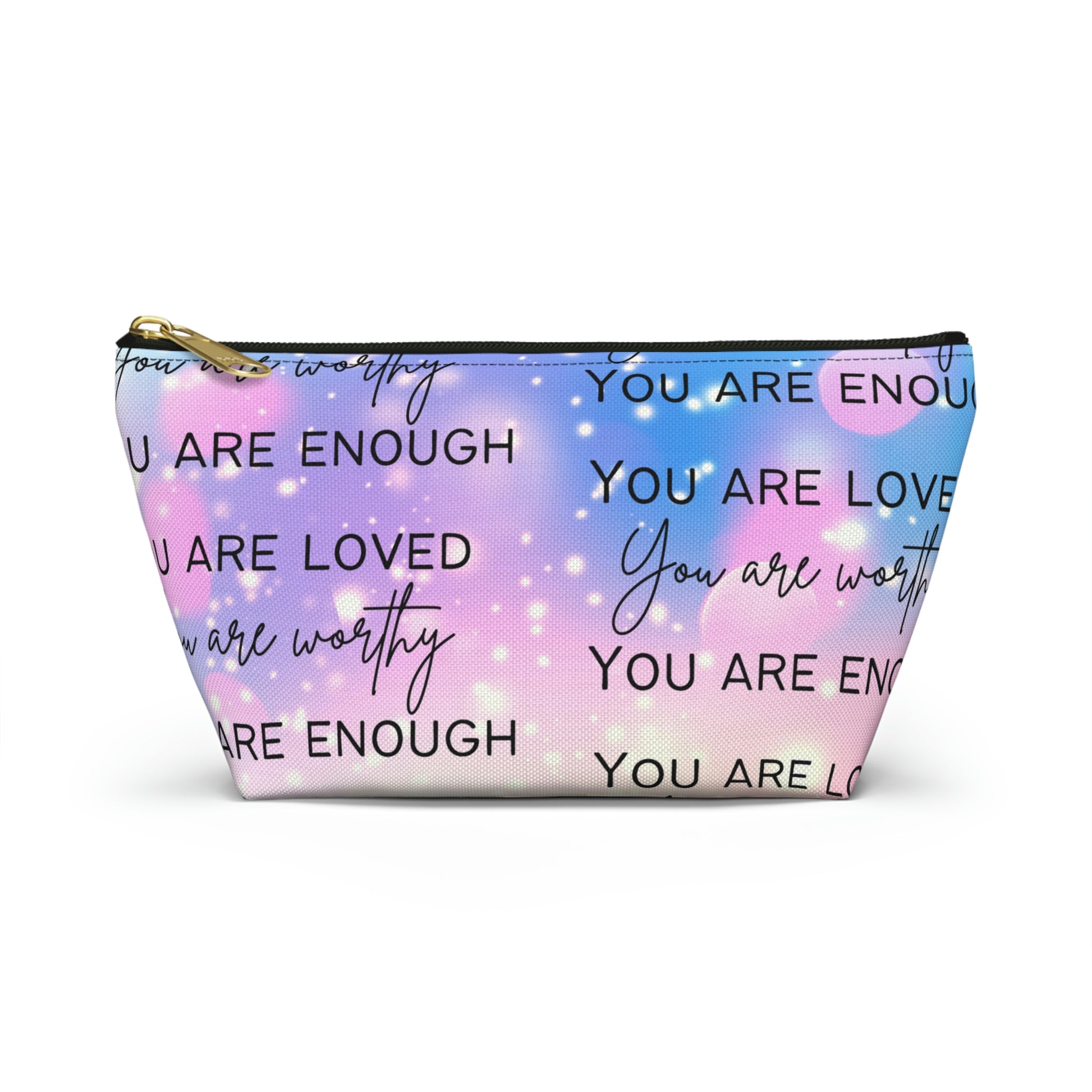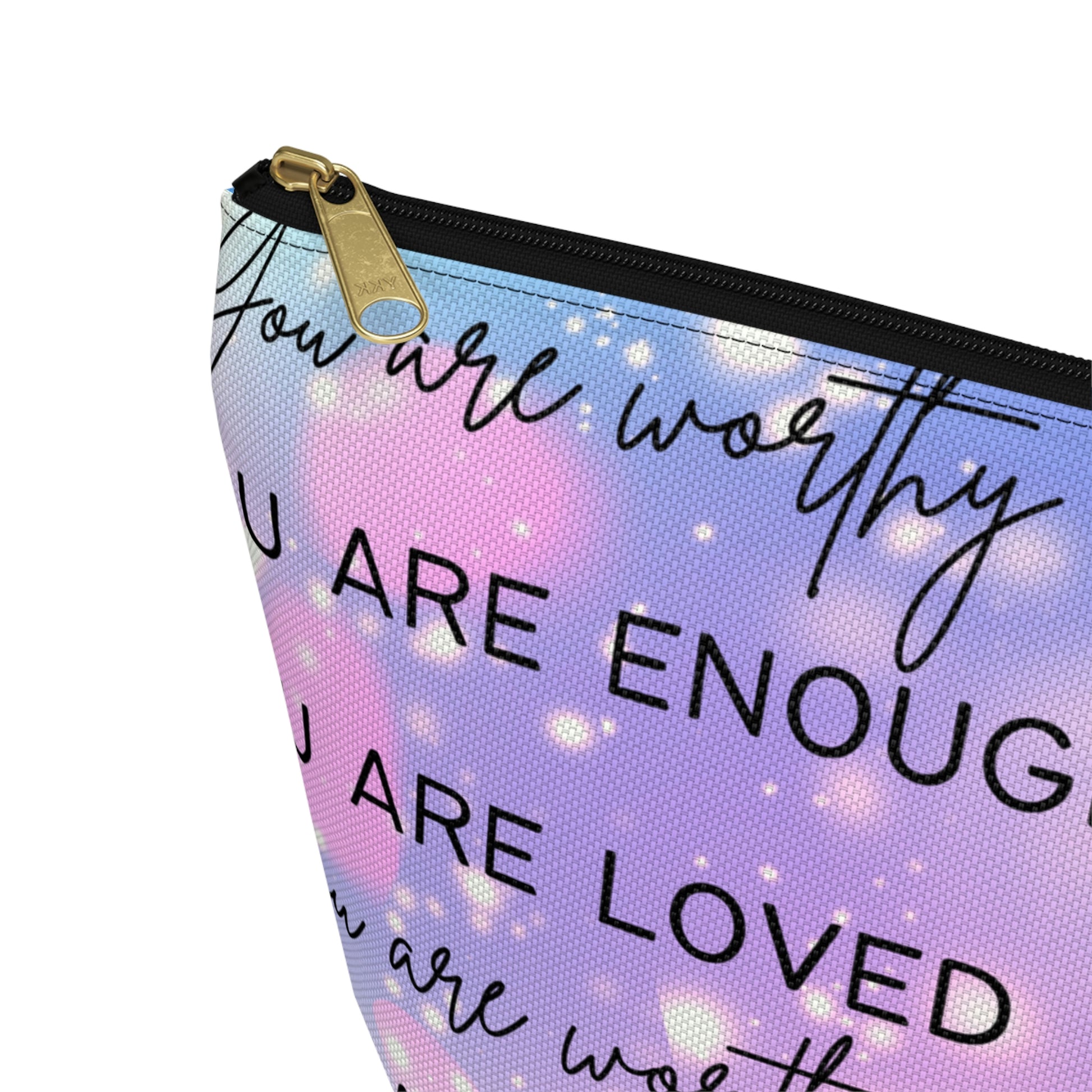 You are loved, You are enough, You are worthy... Carry these positive affirmations with you in this beautiful t-bottom mermaid colored cosmetic/travel bag. Available in 2 sizes, with 2 options for zipper color.