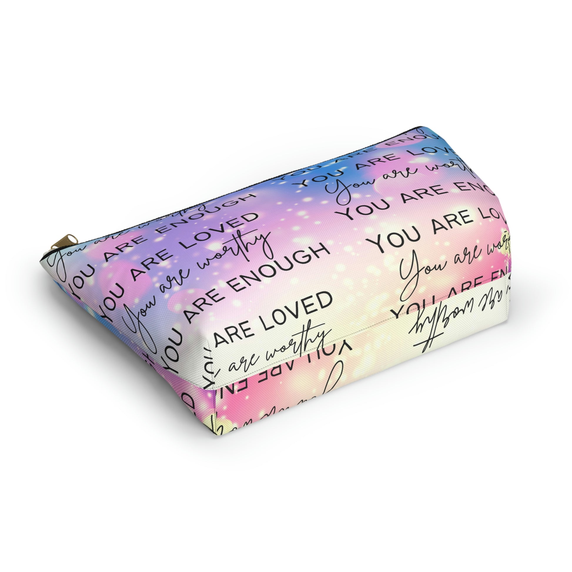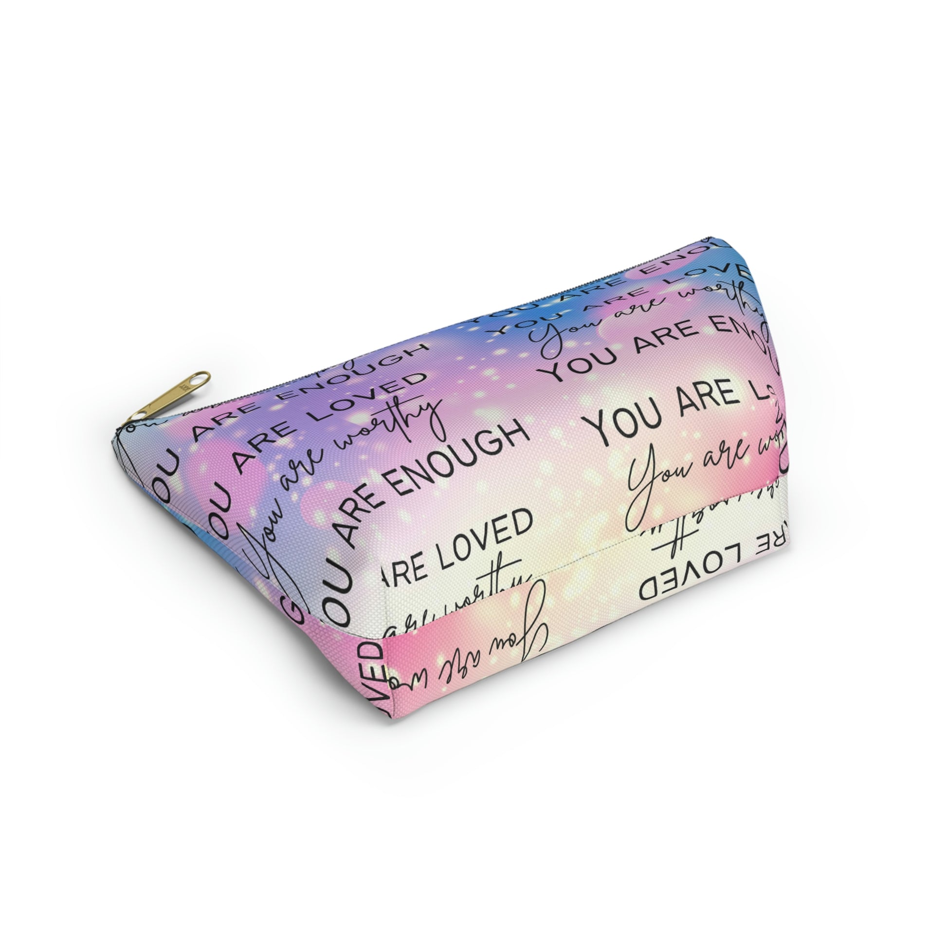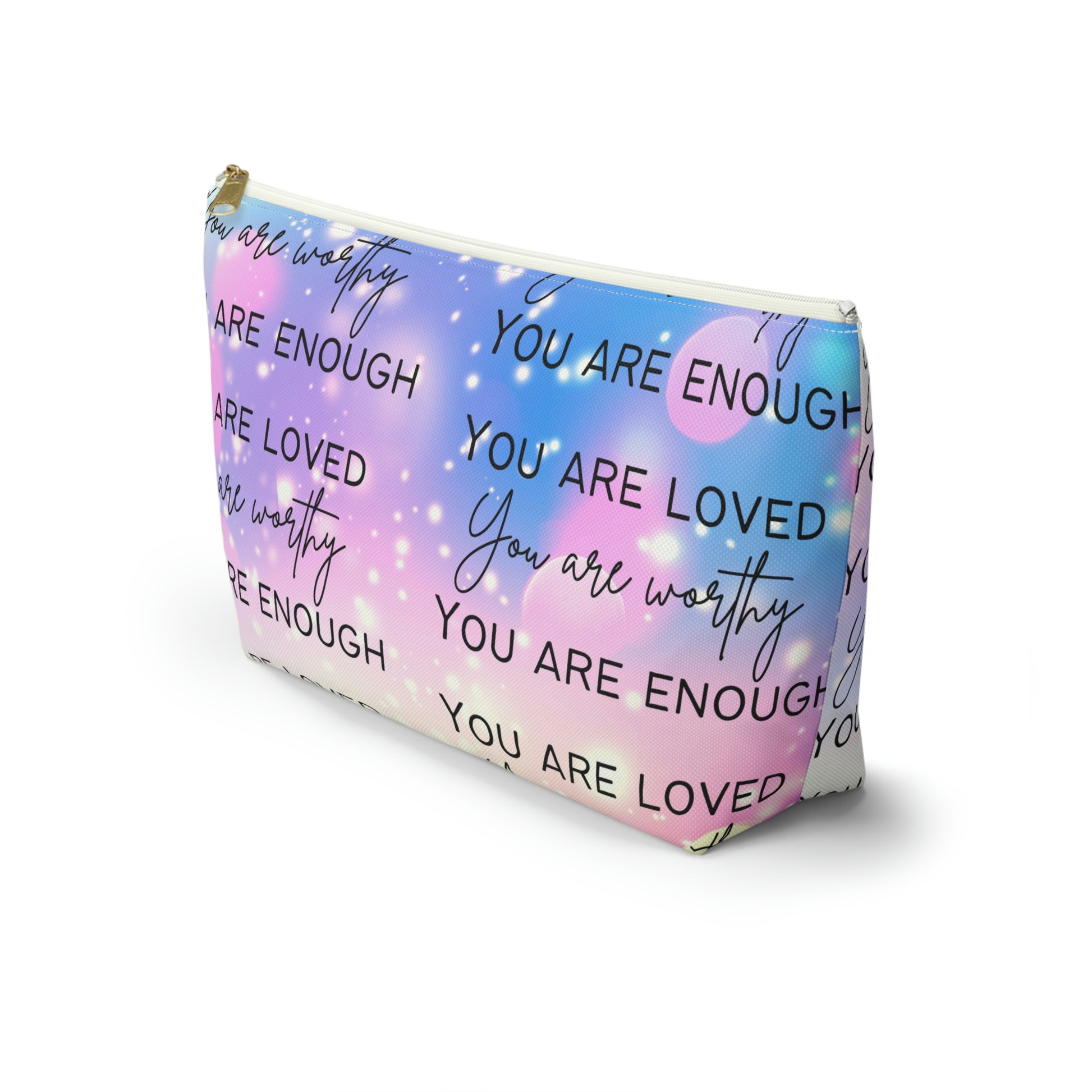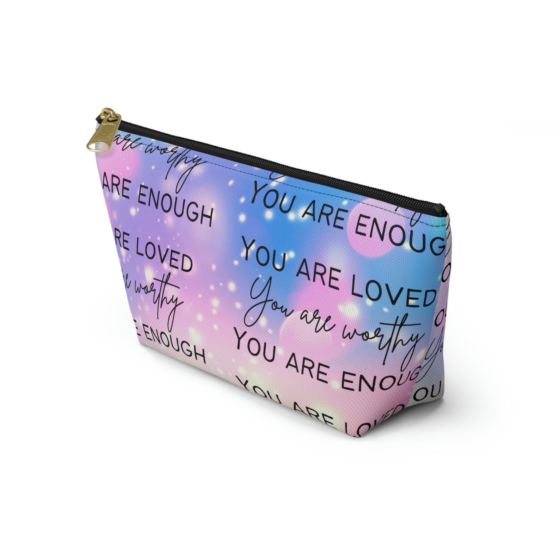 You are loved, You are enough, You are worthy... Carry these positive affirmations with you in this beautiful t-bottom mermaid colored cosmetic/travel bag. Available in 2 sizes, with 2 options for zipper color.