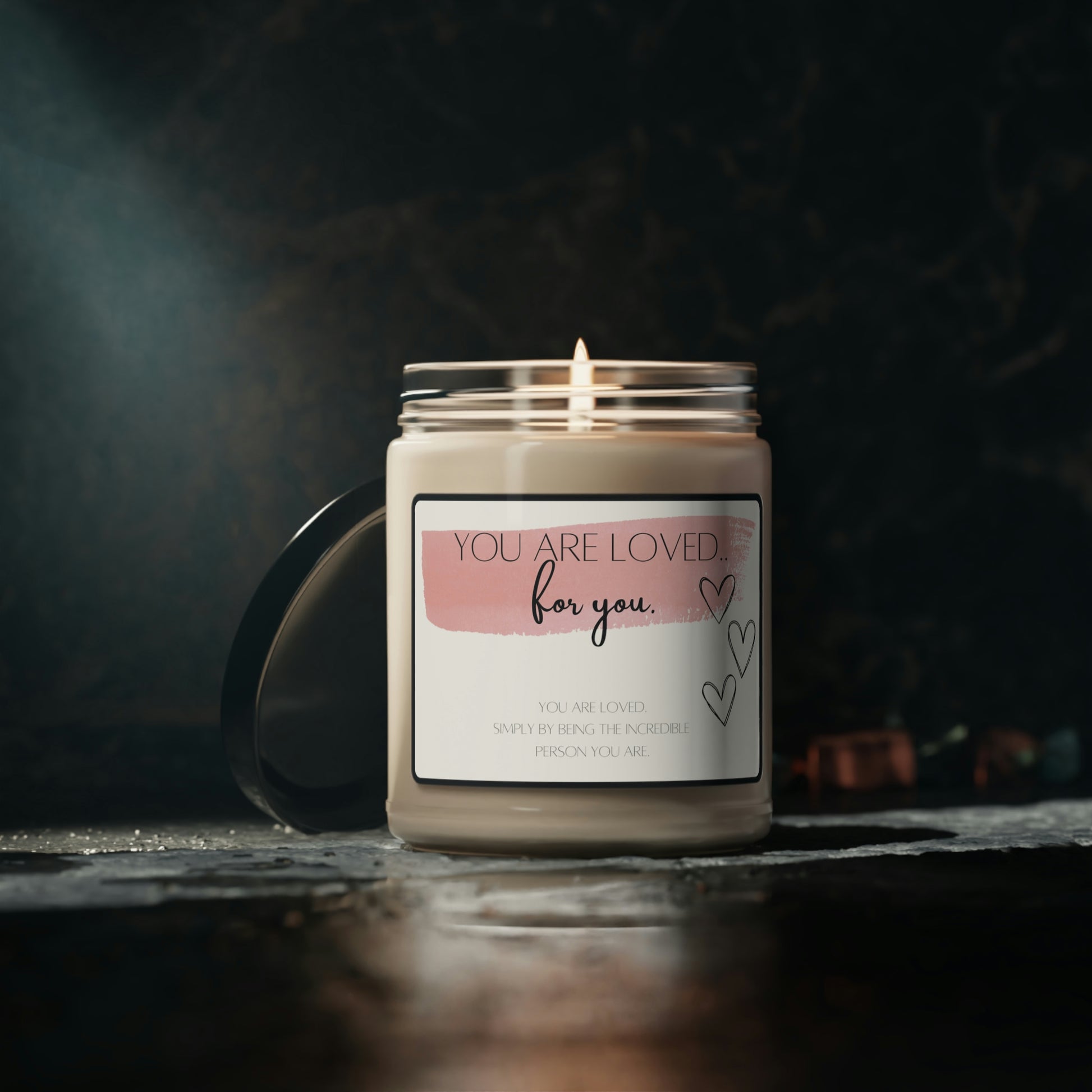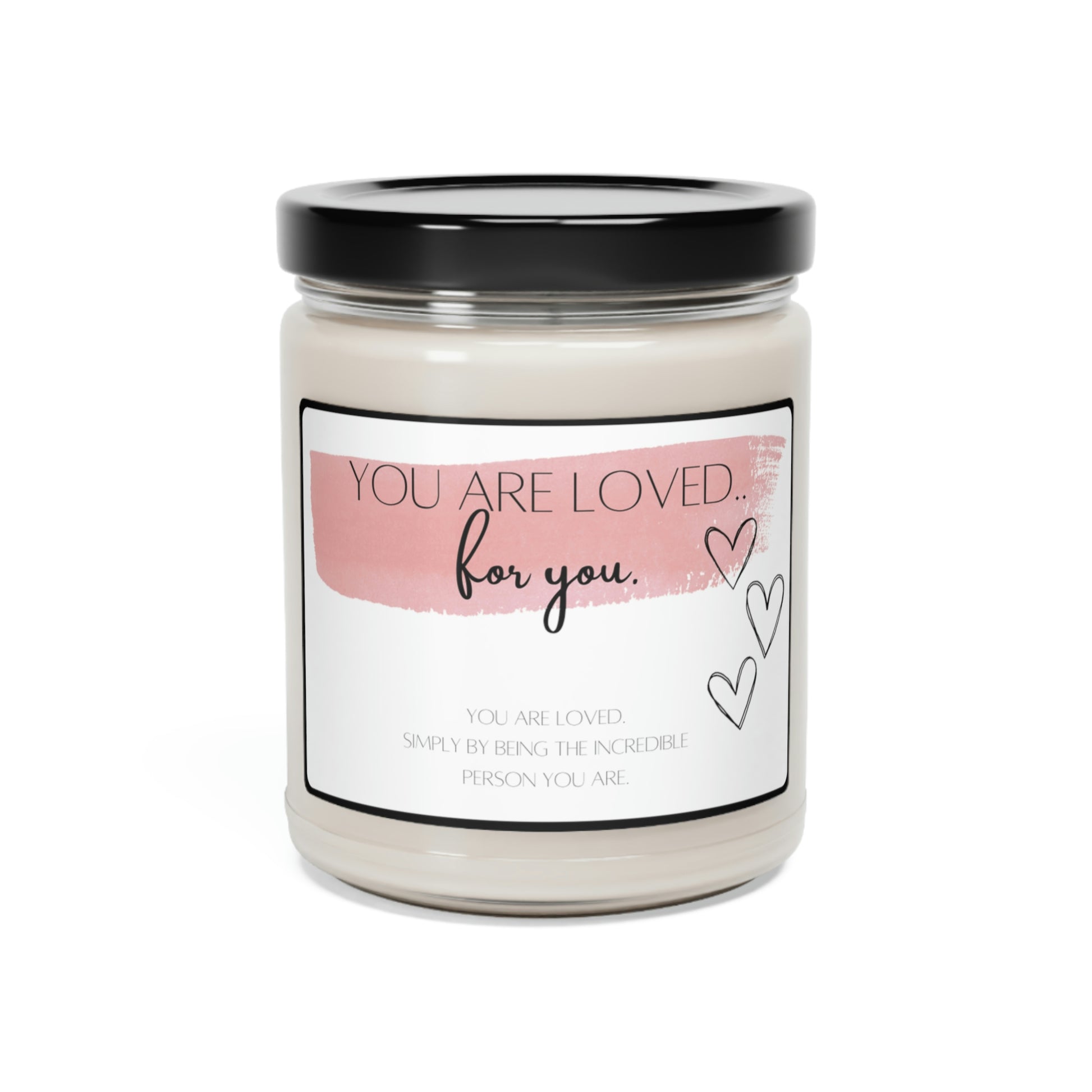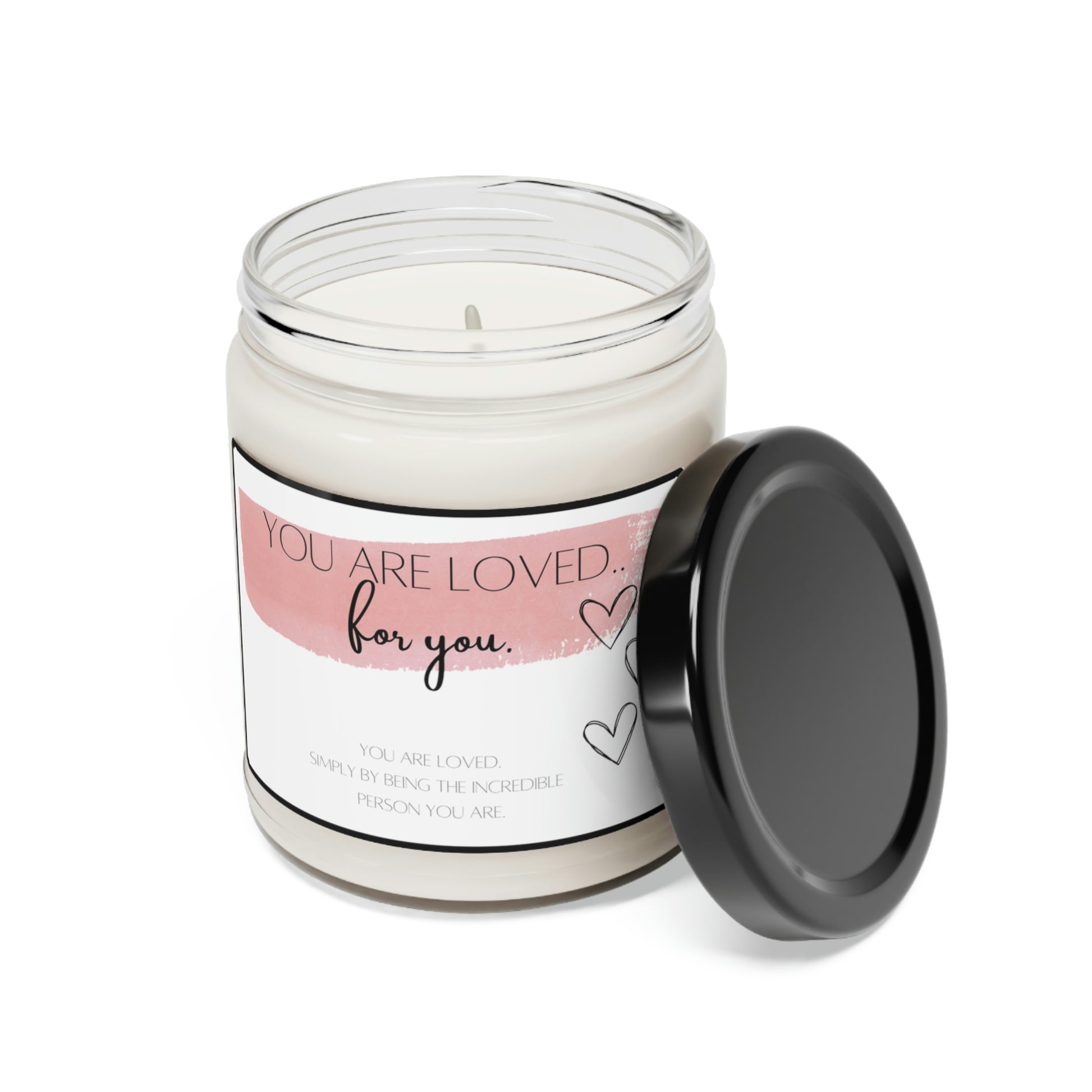 You are loved, for you available in 5 scents, with an impactful message. Packed with immersive aromas, these scented candles come in 9oz glass jars and are one size (2.8″ × 3.5") (7.1cm × 8.8cm). Made with 100% natural soy wax blend, each candle features a 100% cotton wick.